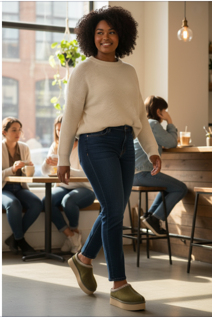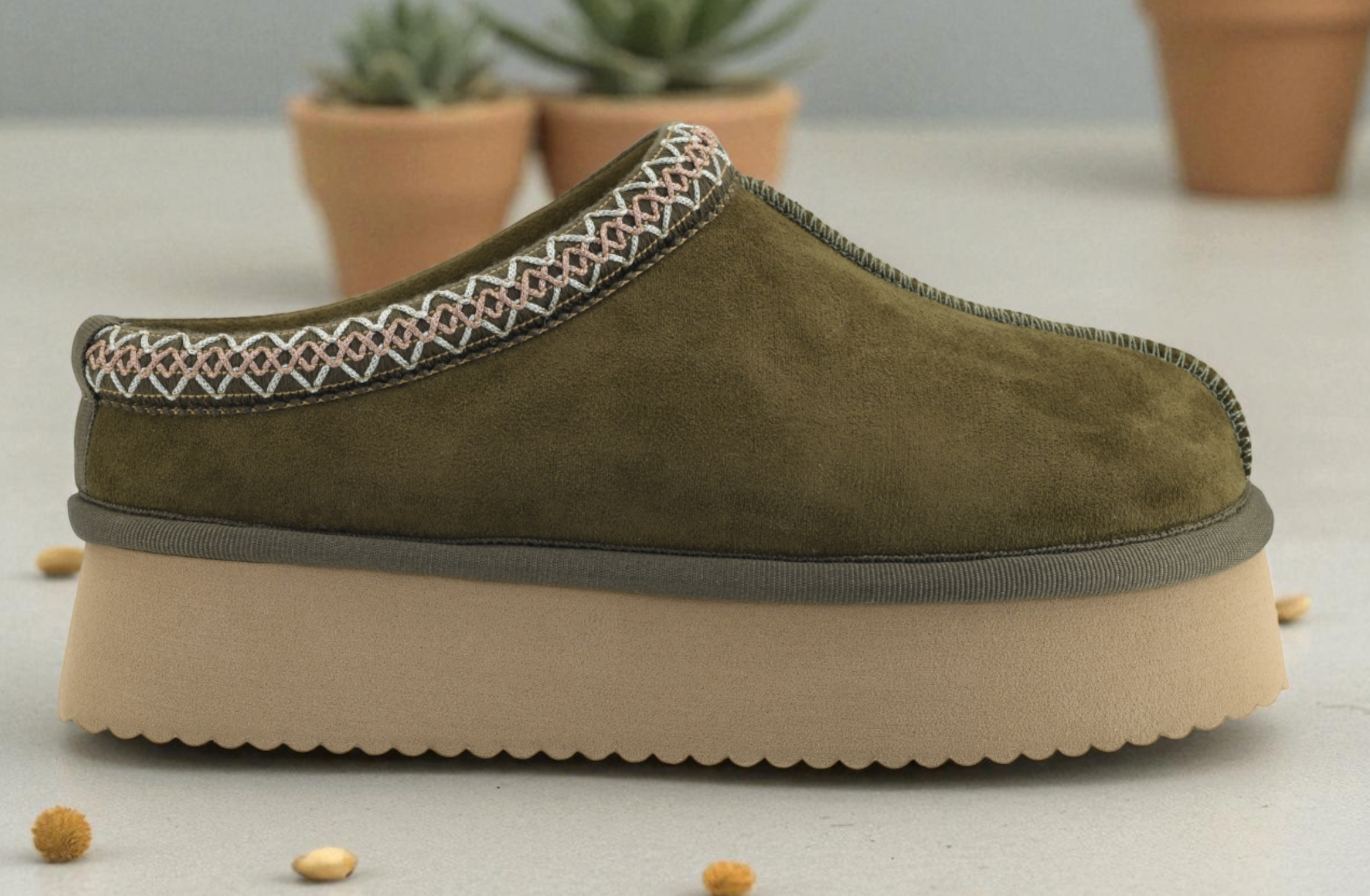 Comodidad y estilo en cada paso 💚✨ Estas plataformas en tono oliva con textura tipo gamuza y detalle étnico bordado te envuelven en suavidad y modernidad. Perfectas para un look casual chic sin renunciar al confort.